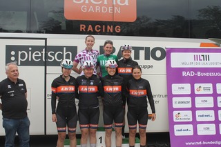 Steinfurt, 13.04.2025 – 2 Trikots und ein 3.Platz sprangen beim 2. Bundesligarennen in Steinfurt raus. Den 3. Platz errang Mira Winkelhag, die aber vor allem ihre Teamkolleginnen lobte. „Das war so toll, wie alle für das Ergebnis gefahren sind – ohne Ausnahme!", so Mira. „Der Kurs, der elfmal zu absolvieren war, hatte es in sich. Es gab Windkante, nasse Straßen, schnelle Abfahrten und damit einige Stürze. In einen davon war leider auch Nele verwickelt. Wir haben versucht, uns kompakt als Team vorn aufzuhalten – zum einen, um den Stürzen aus dem Weg zu gehen und zum anderen, um das Rennen auf unsere Seite zu ziehen, da wir auch wieder in den Berg- und Sprintwertungen punkten wollten.